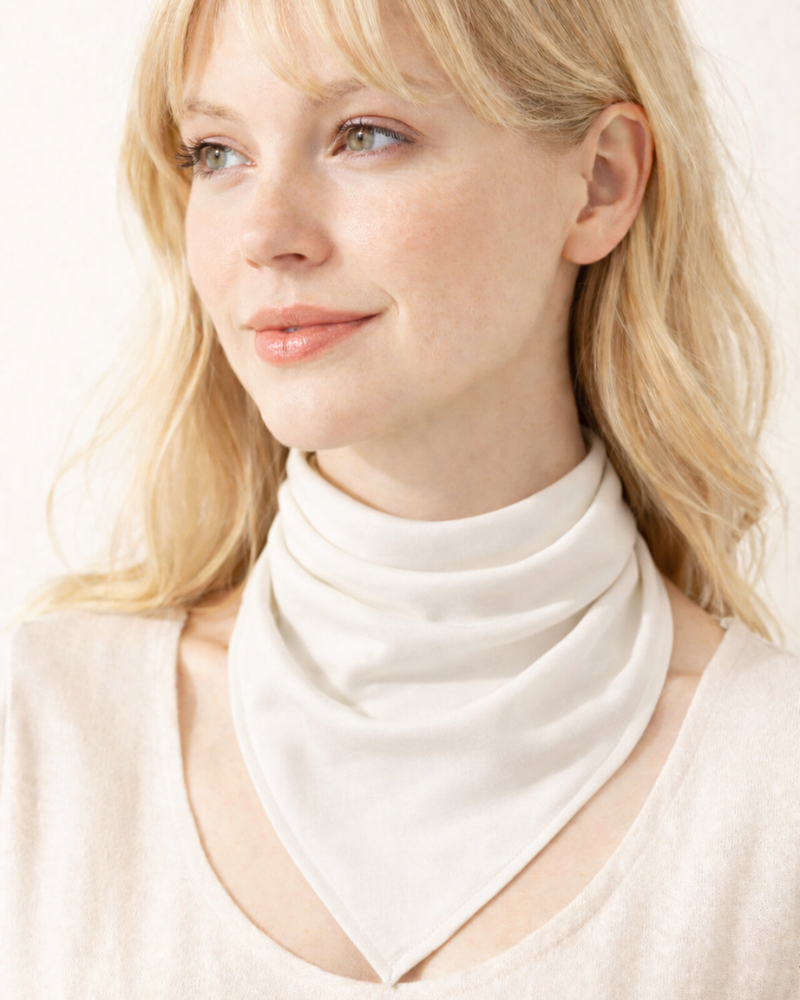 Chustka ColourMe! Star White dla typu urody Jasna Wiosna to kwadratowa chustka z miękkiej dzianiny bambusowej w jasnym, rozświetlającym odcieniu bieli. Noszona blisko twarzy dodaje świeżości cerze, podkreśla lekkość urody i pozwala w prosty sposób zharmonizować nawet bardzo neutralne stylizacje.