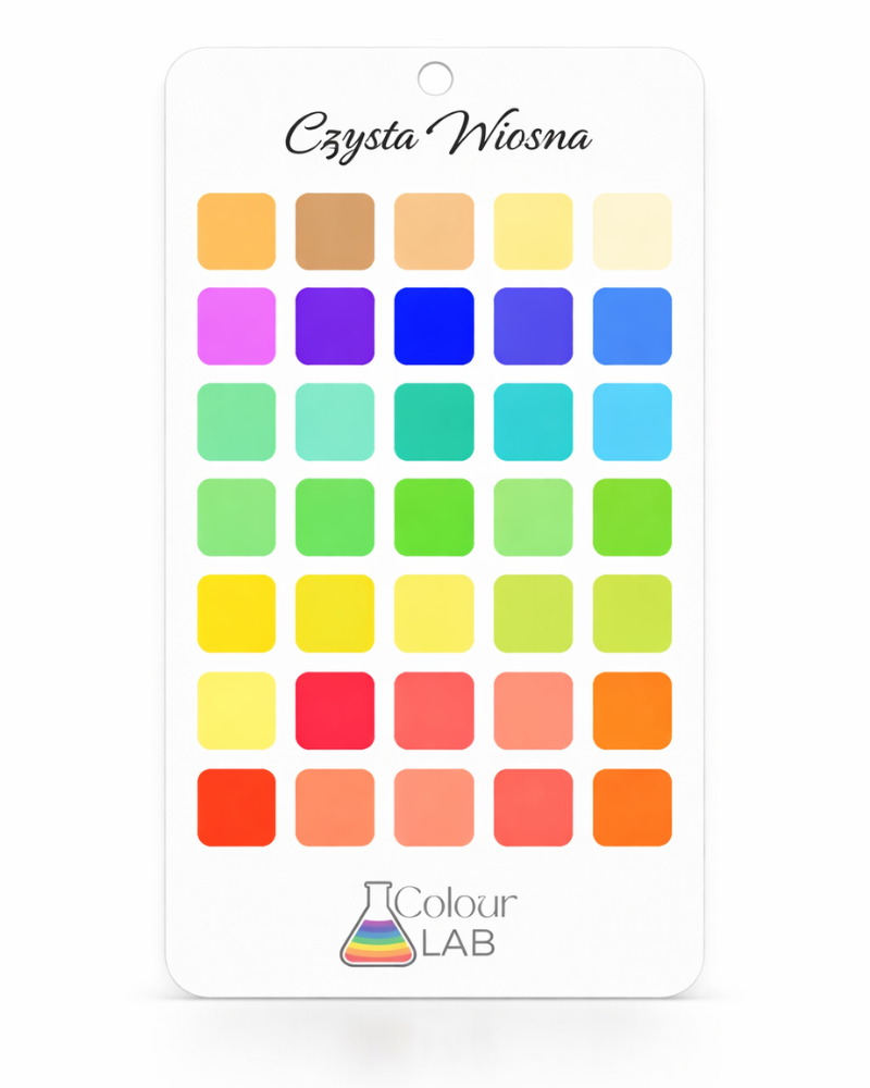 ColourKey Clear – Czysta Wiosna to przezroczysta paletka kolorów zaprojektowana dla kobiet o jasnej, intensywnej i wyraźnie ciepłej urodzie. Ułatwia szybkie i trafne wybieranie ubrań, tkanin, dodatków oraz kosmetyków w kolorach, które podkreślają energię i świeżość Twojej palety.