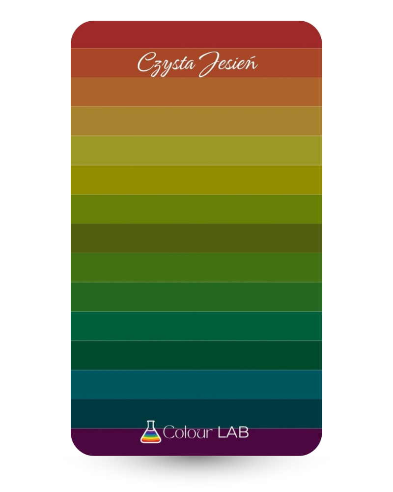 ColourKey Pocket – Czysta Jesień to profesjonalna karta kolorystyczna wykonana z grubego papieru, zawierająca najlepsze odcienie dla typu urody Czysta Jesień. Ułatwia świadomy dobór ubrań, tkanin, dodatków oraz makijażu w kolorach, które podkreślają czystość, ciepło i intensywność tej palety.