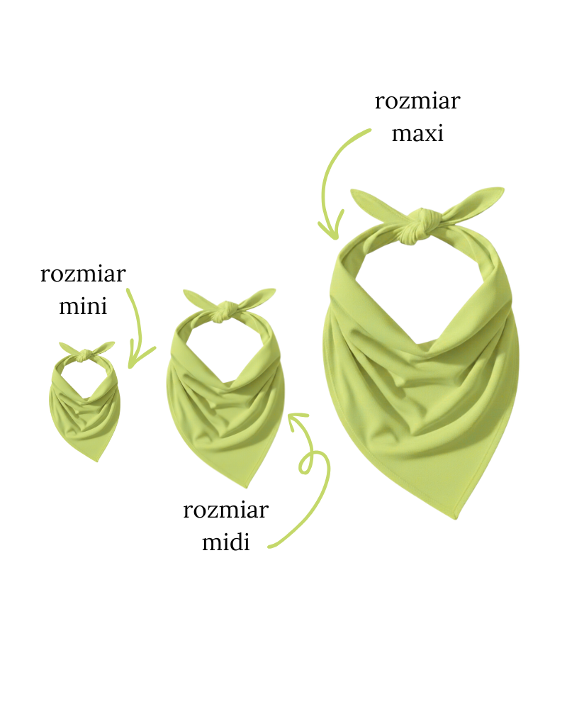 - midi – 70 × 70 cm – najbardziej uniwersalny rozmiar do noszenia na szyi, głowie lub ramionach